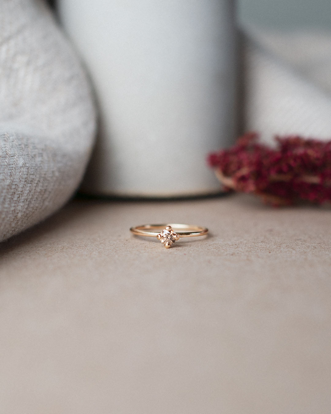 This ring features a 0.20 CT champagne diamond. It has belonged to one of our customers since 2019 and is very well-maintained and in great condition.
