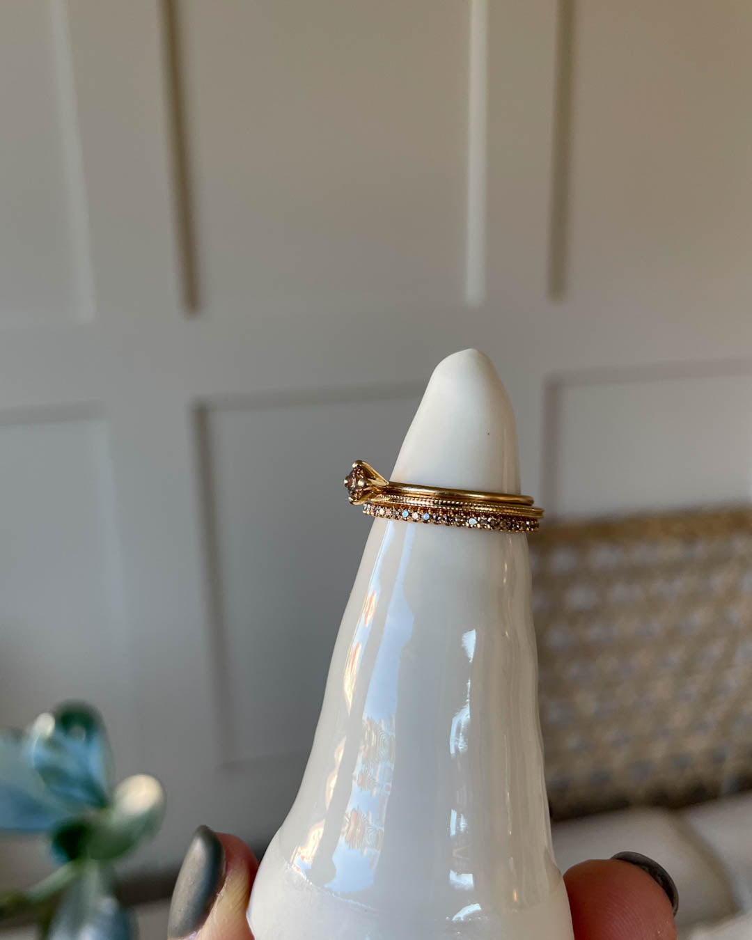 This ring looks amazing alone on the ring finger or middle finger but is also great for stacking and works well with many rings from our collection.