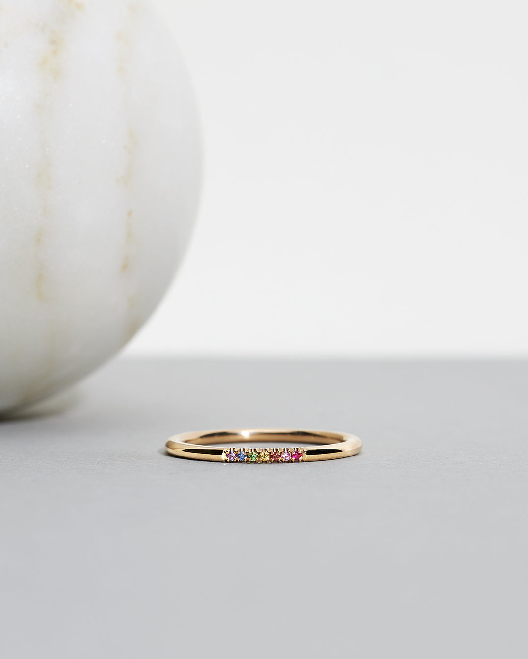 Jade Petite Enough Ring is a lovely simple ring with seven small gemstones. This version features a gradient of bright rainbow colors.
