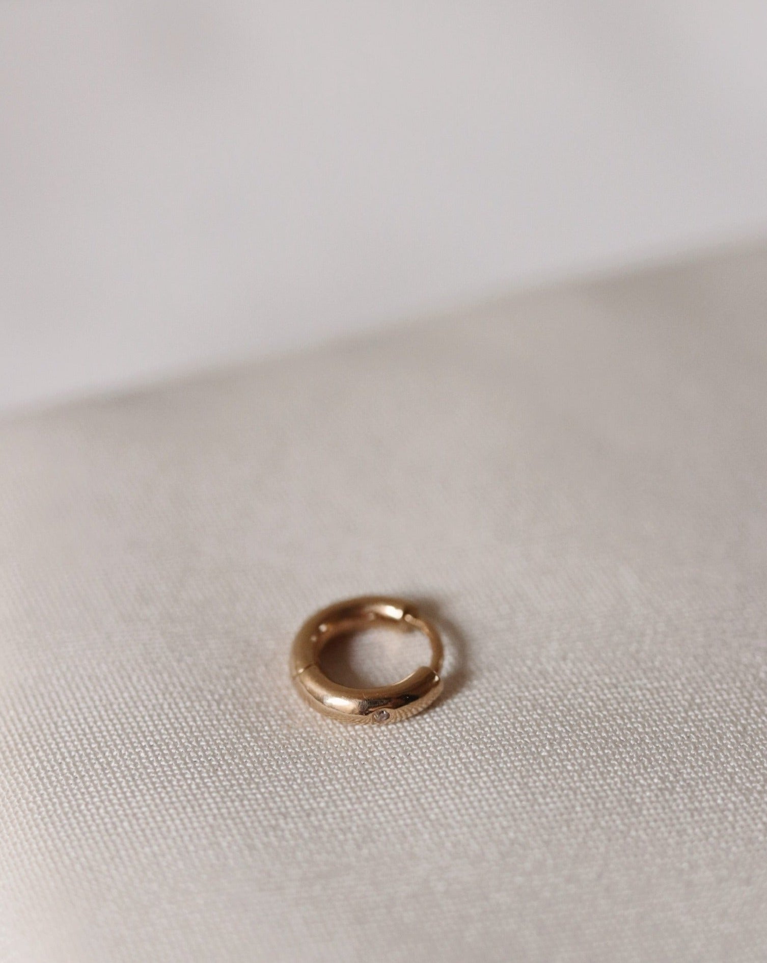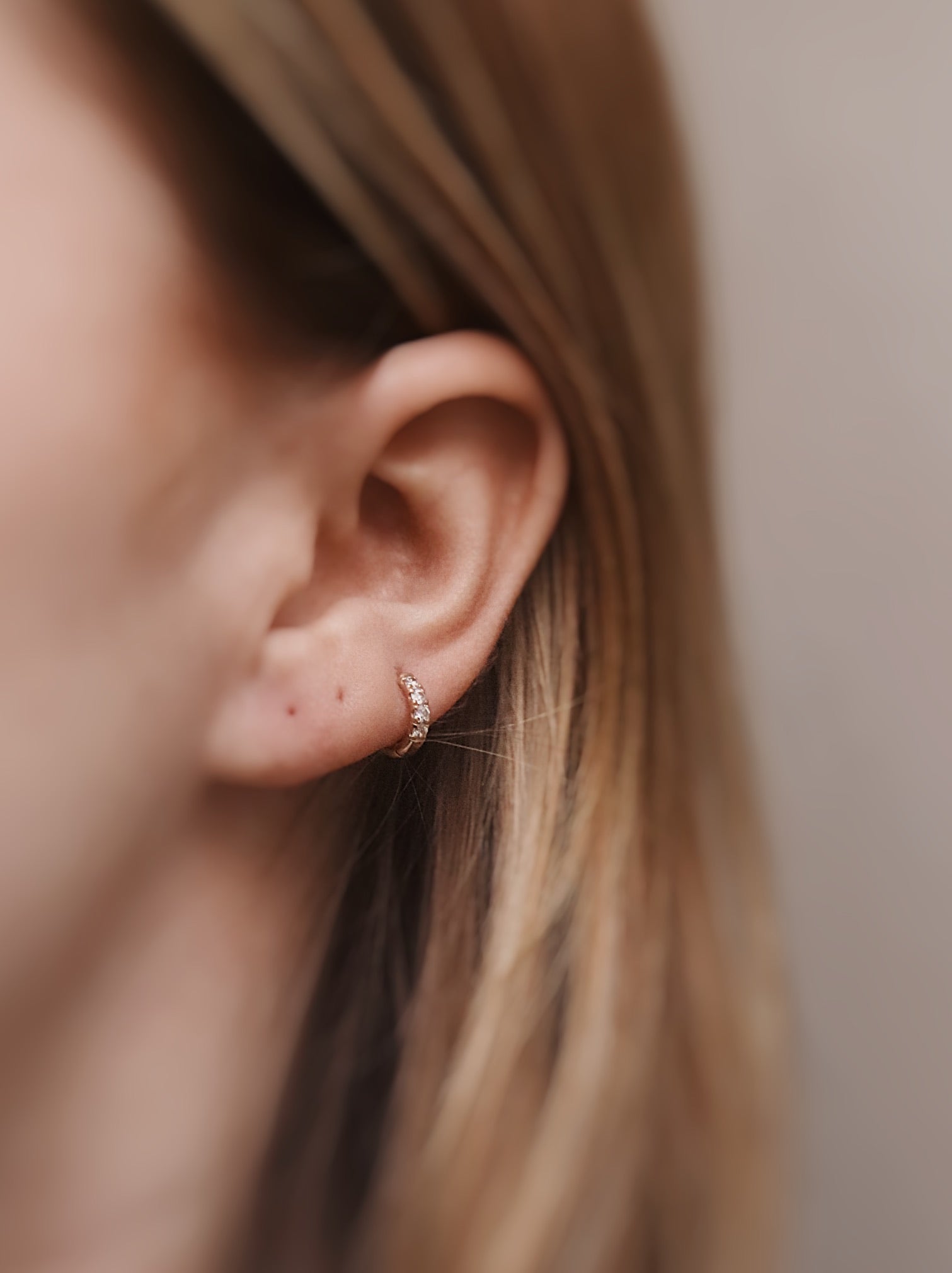 The thick diamond huggie is a key piece of my capsule jewelry wardrobe. I wear a 6 mm in the third hole of my ear. Xx Cecilia