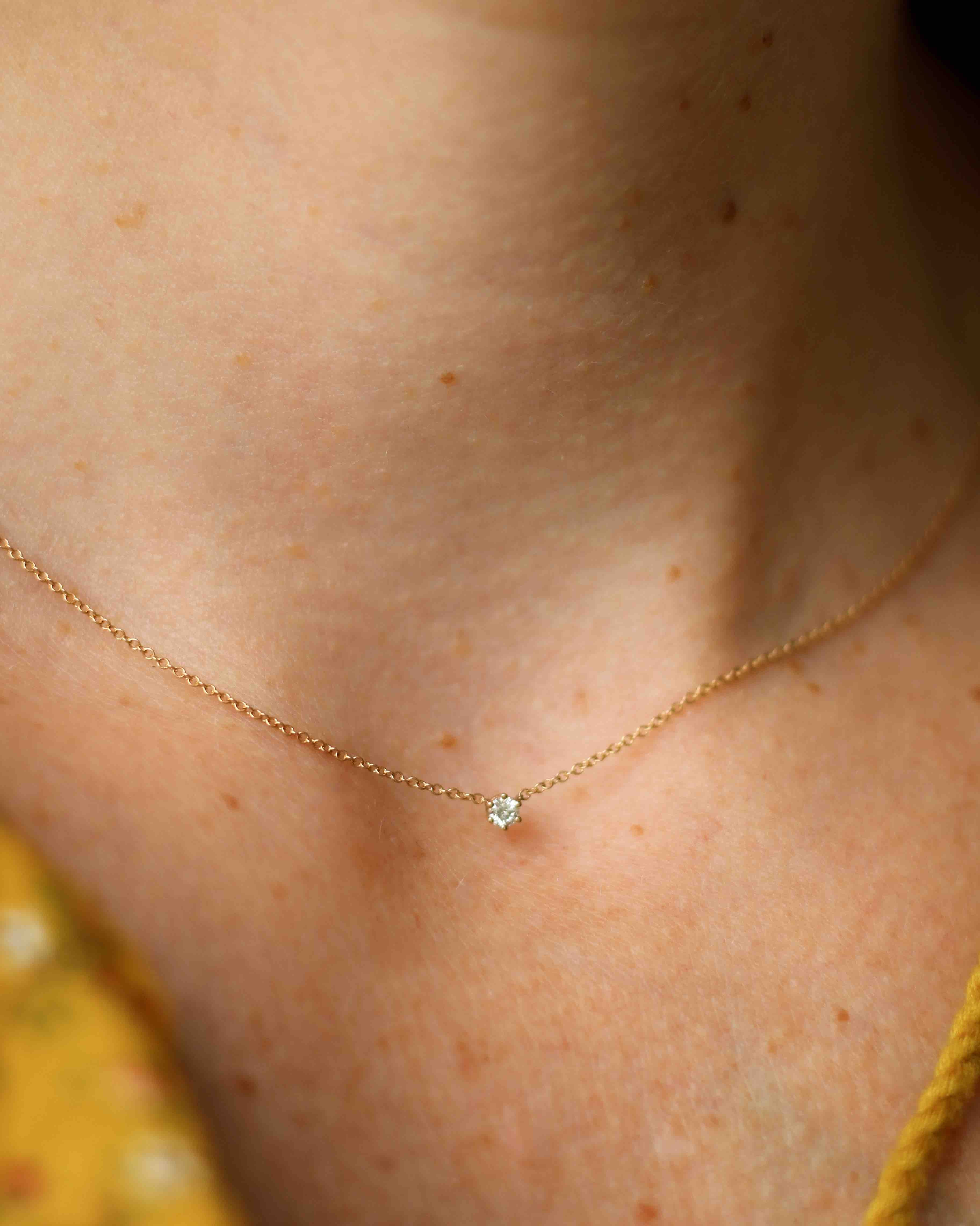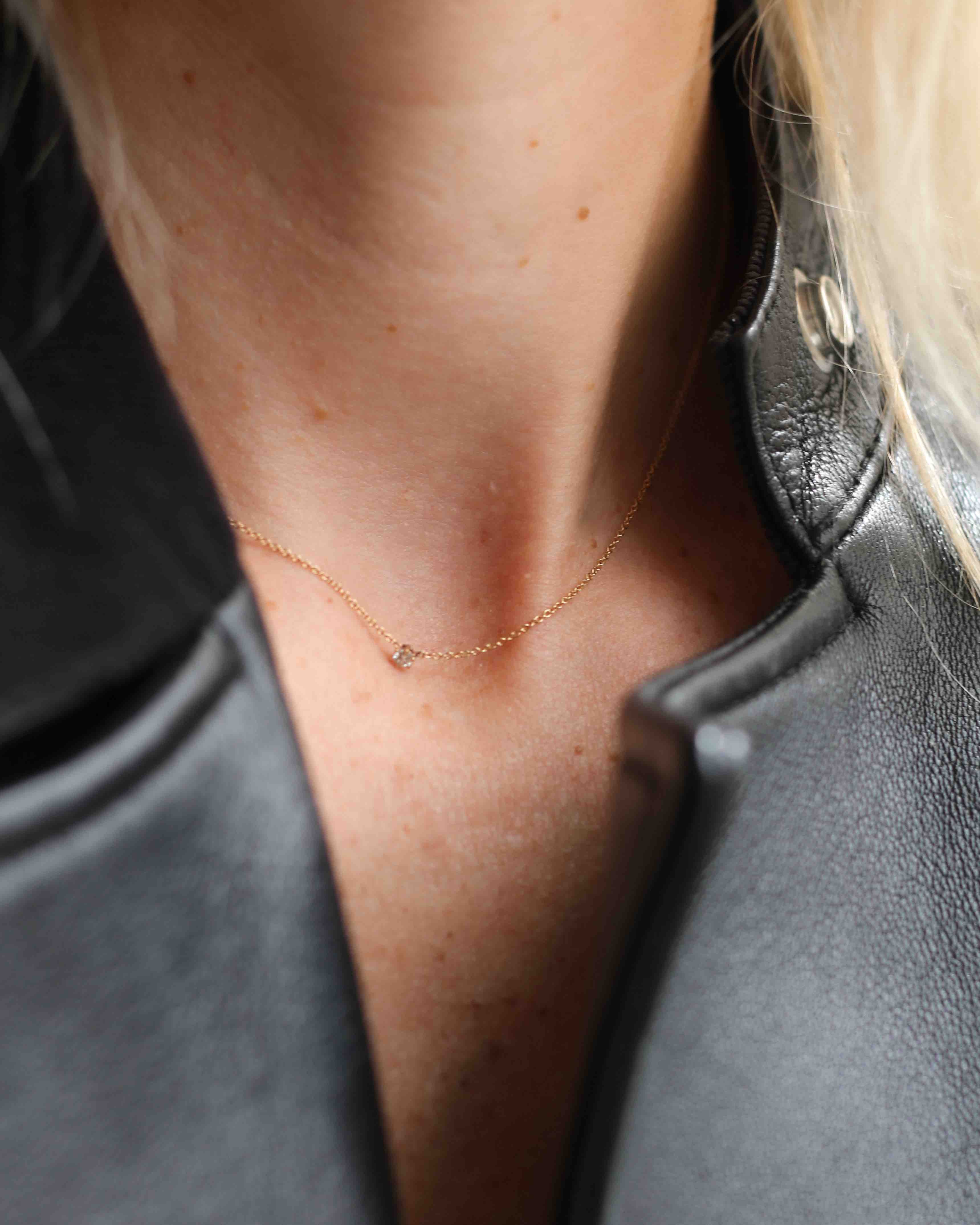 Eftersom diamanten är fäst direkt i kedjan, så håller sig diamanten (för det mesta) i halsgropen och låset därbak. Det älskar jag med detta halsbandet!