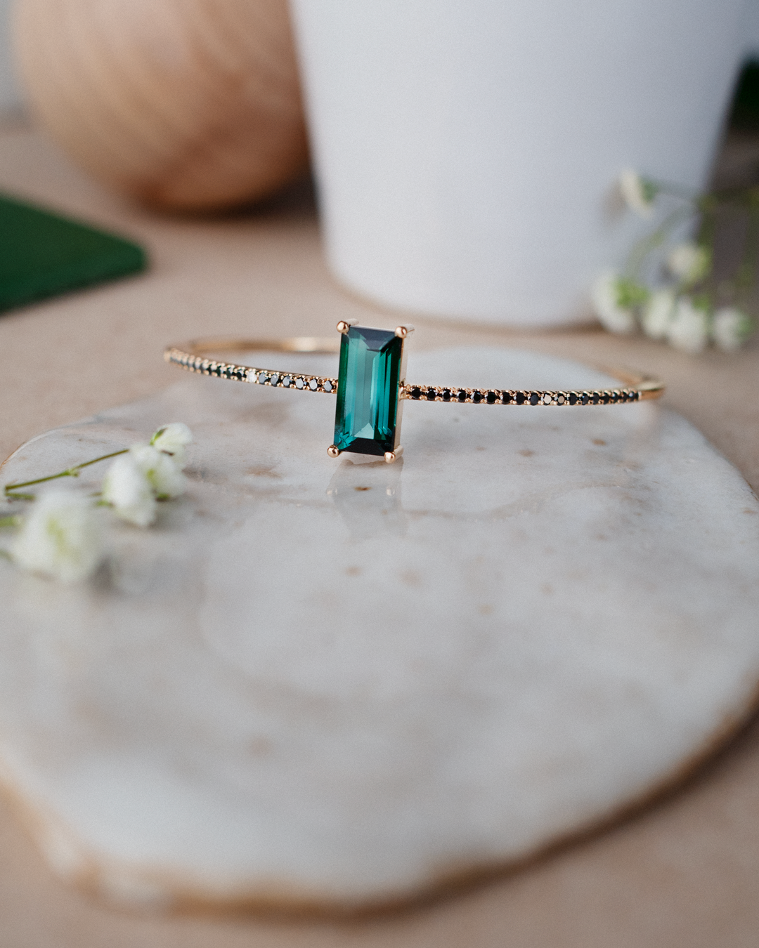 Den mörka turmalinen och de svarta diamanterna gör att detta armband får en dov elegans runt sig som inte på något sätt tar över.