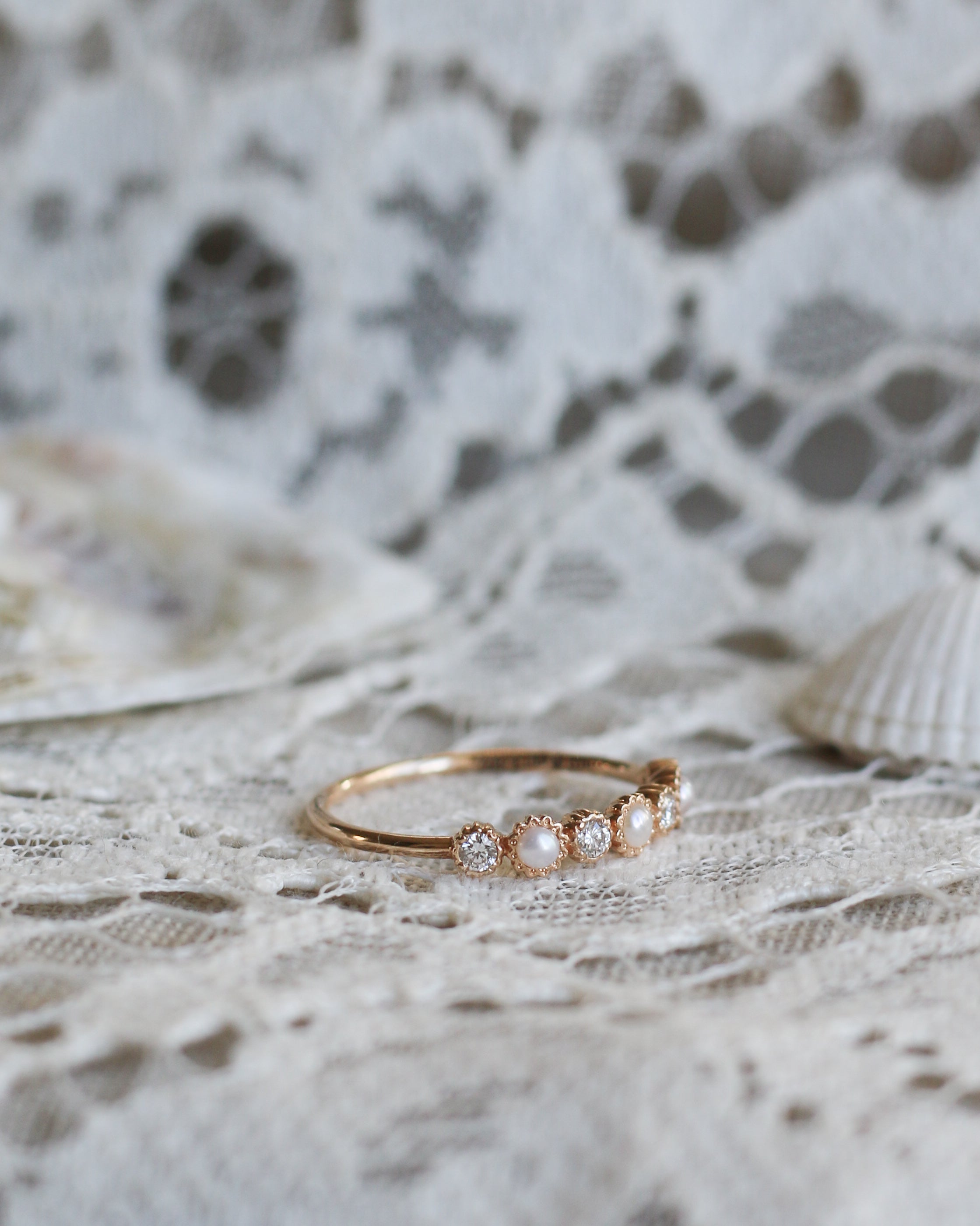 En elegant soiréering med snäckformade gulddetaljer, glittrande diamanter och skimrande sötvattenspärlor.